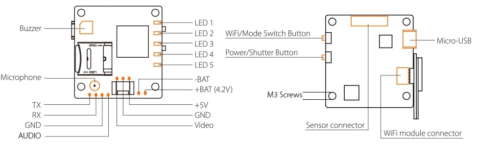The biggest piece of news here is the 165° FOV HD recording at 1080@60fps. The RunCam 3 offered us a 155° FOV HD recording at 1080@60fps so we should be able to expect similar performance with this all in one camera. RunCam is also advertising the same WDR (Wide Dynamic Range) algorithm included with the split to improve image detail under high contract light conditions. Similar to the RunCam 3, we have mobile phone app support with the removable WiFi module mounted on the PCB.