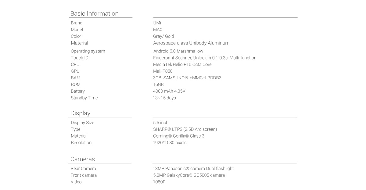 5.5" Inch UMI Max IPS FHD Display 4G Smart phone Android 6.0 MTK Helio P10(MT6755M) Octa-Core 1.8GHz Mobile phone Dual SIM Dual Standby 3GB RAM 16 GB ROM 13.0MP Back Camera /Fingerprint Scanner /4000mAh Battery /OTG/Wifi/Bluetooth/Grey/UK